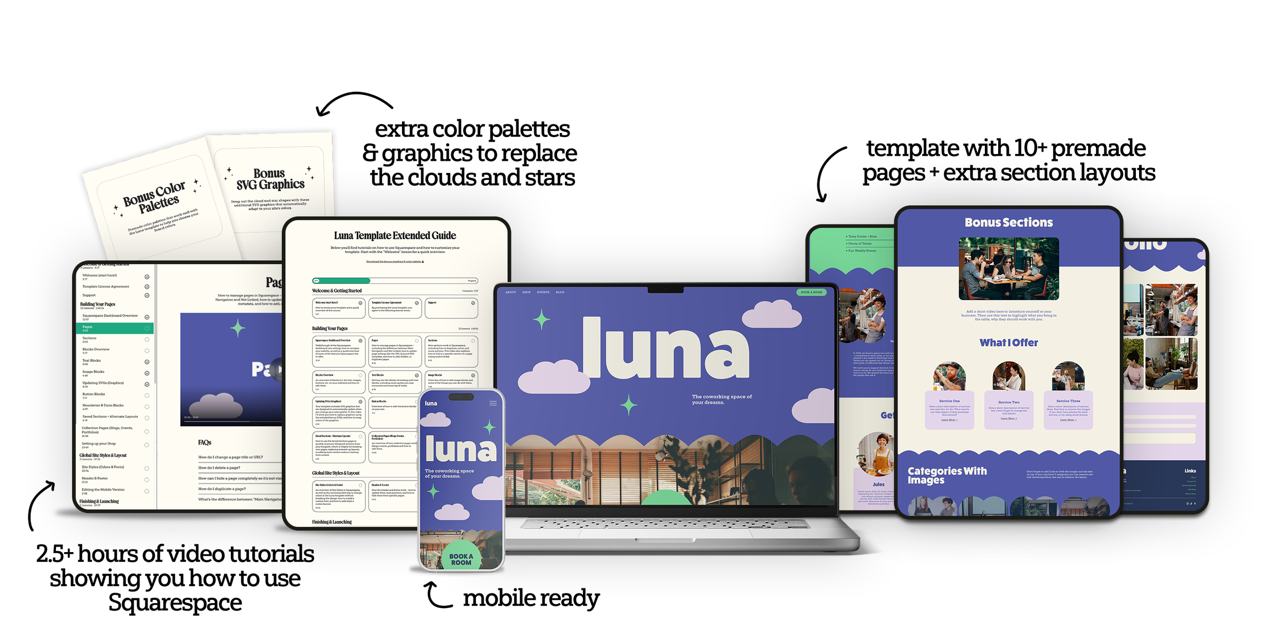 It comes with a Quick Start Guide with a few videos (~25 mins of content) walking you through the specific things to know about this template (like swapping out the graphics, explaining the color framework, etc.). The Basic package assumes that you already know how to use Squarespace, and so gives you an opportunity to purchase the template at a lower cost since you won’t be needing the extra tutorial instructions.